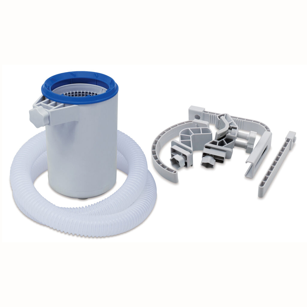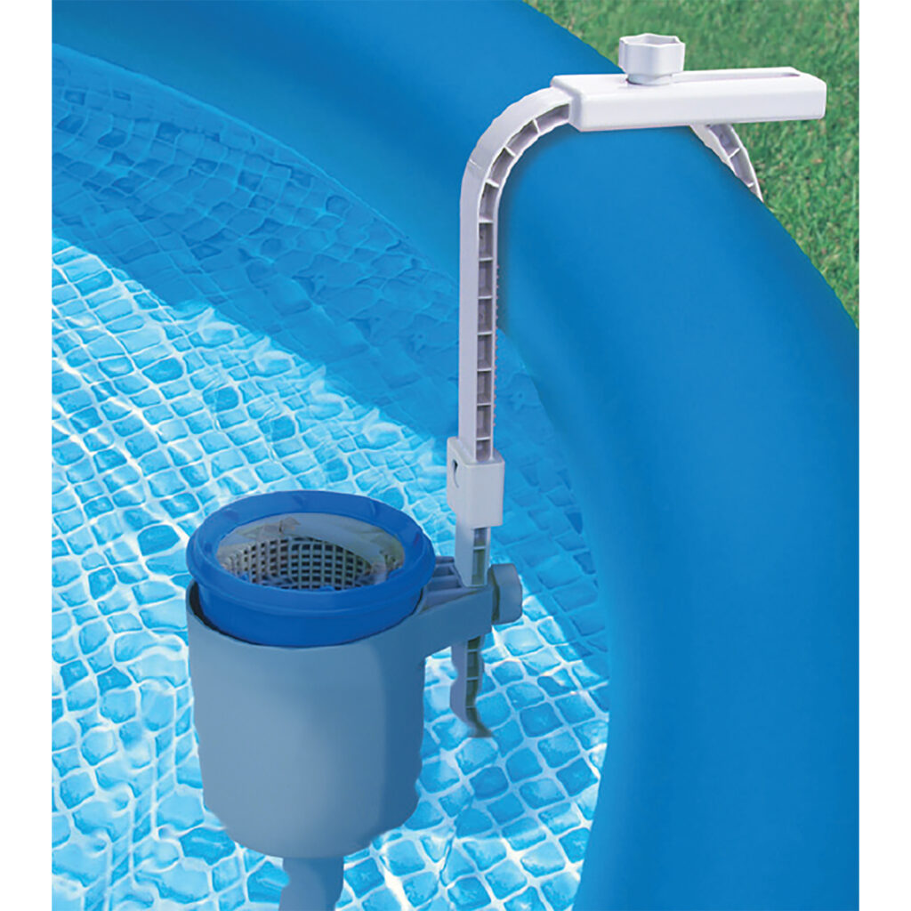 The surface skimmer has an adjustable bracket that hooks onto the side of a pool and can be moved up or down in level with the water’s surface. The skimmer’s little hose attachment connects to the swimming pool inlet, where water is drawn out by the external filter pump. As water is sucked towards the surface skimmer its straining basket traps debris, such as dead beetles and fallen leaves.