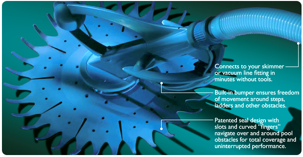 We have added a patented silent flapper to the Hammerhead pool cleaner that generates kinetic energy. This solitary moving part produces the power that propels the Hammer Head around your pool in its ruthless search for and removal of debris.