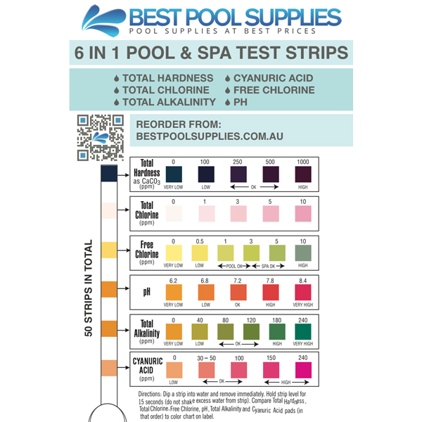 The Best Pool Supplies 6 in 1 Pool and Spa Test Strips are the simple and effective way to test your pool and spa yourself. With a simple dip test you can know your pool or spas total water balance in only 15 seconds, without the need for complex chemical reactions, or to take a bottle into a pushy pool shop. With these strips you will easily see your pool or spas TOTAL HARDNESS, TOTAL CHLORINE, FREE CHLORINE, pH, TOTAL ALKALINITY and CYANURIC ACID like a pro.