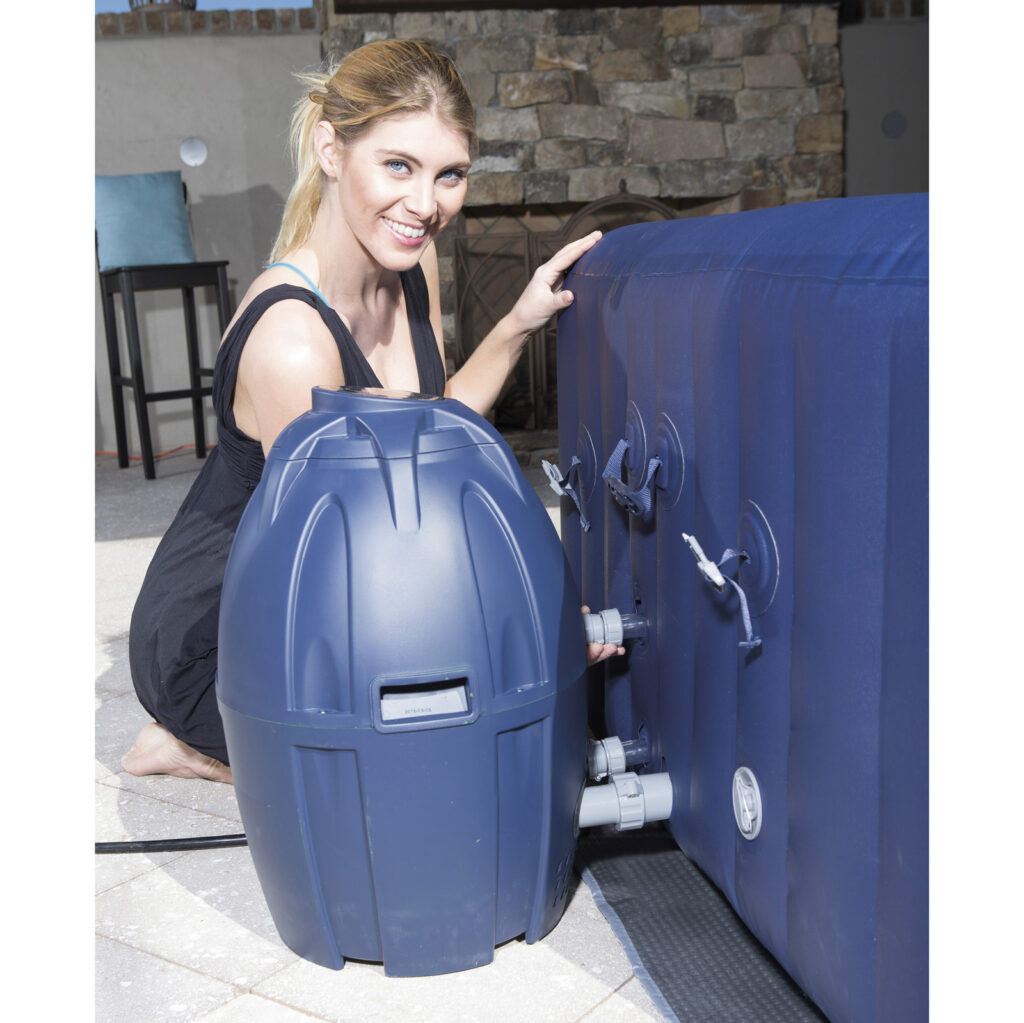 The included pump inflates the spa, heats the water, runs filtration, and controls the massage system. Easily accessible from inside the spa, it also features built-in cup holders for drinks and snacks. The ChemConnect dispenser maintains clean, balanced water, while the reinforced cover locks in heat and keeps debris out.