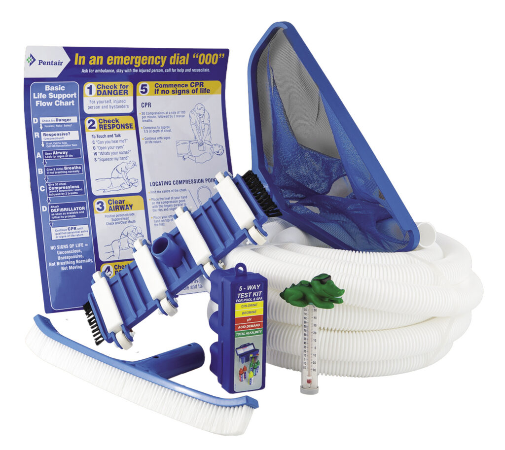 Premium quality complete pool maintenance / handover kit for concrete pools. Kit consists 8 wheel vac, CPR sign, leaf rake, 4 way test kit, thermometer, vac hose and pool brush. Manufacturer Onga / Pentair water. Standard hose lenght is 9m.