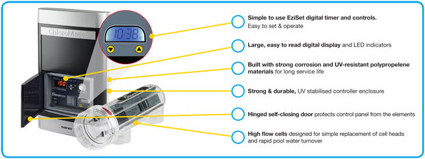 Enjoy Davey’s easy-to-use controls, easy-to-clean reverse polarity cell and easy-to-forget automatic pH control.